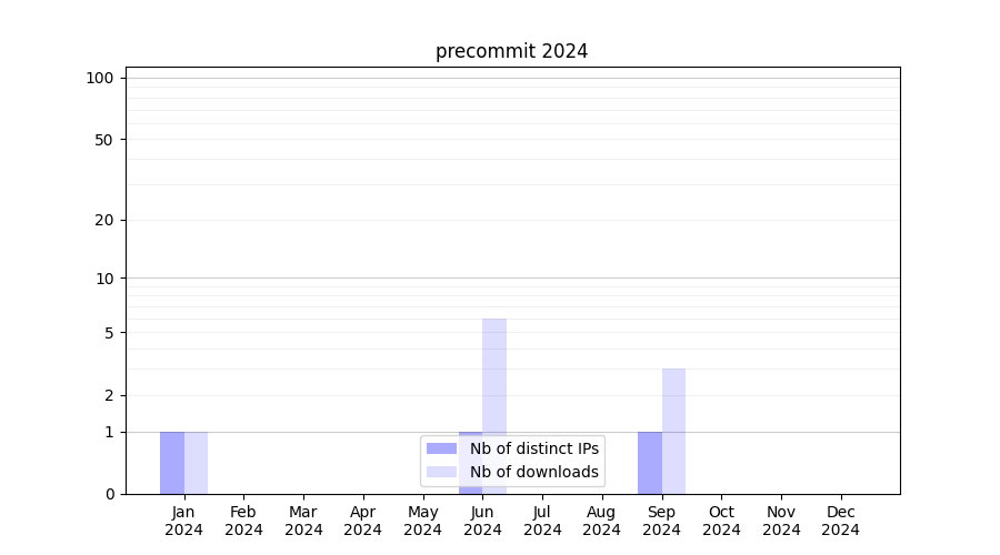 Number of downloads for experiment package precommit, year by year, from 2025 back to 2014 (years with no downloads are omitted):
