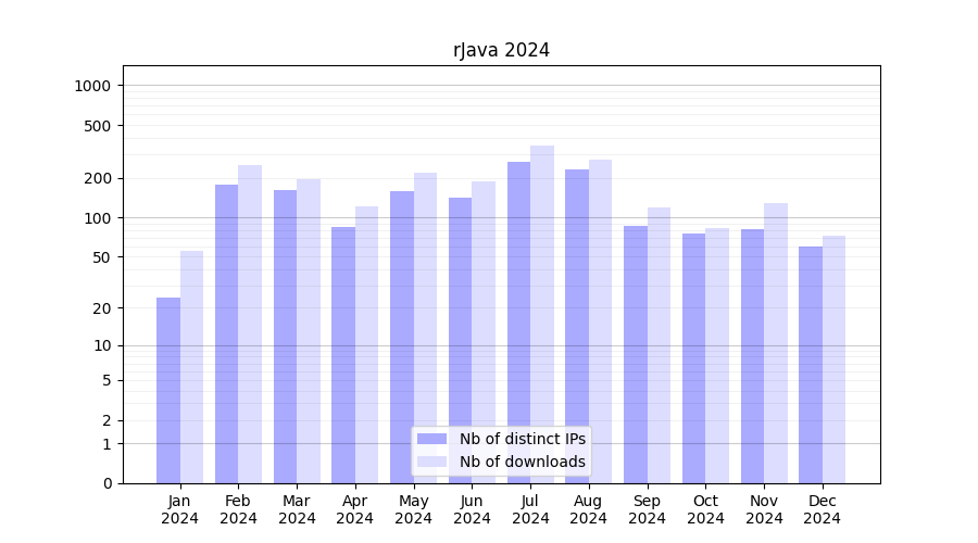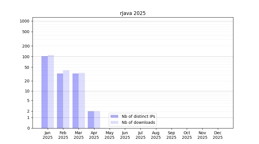 Number of downloads for experiment package rJava, year by year, from 2025 back to 2014 (years with no downloads are omitted):
