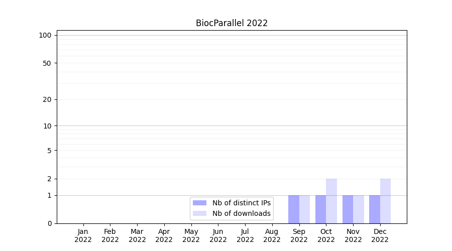 Number of downloads for workflow package BiocParallel, year by year, from 2025 back to 2015 (years with no downloads are omitted):