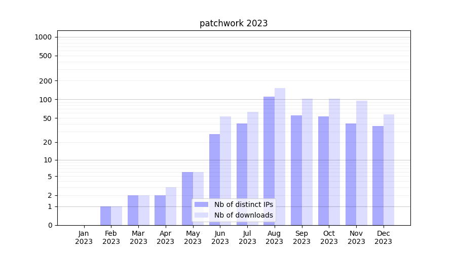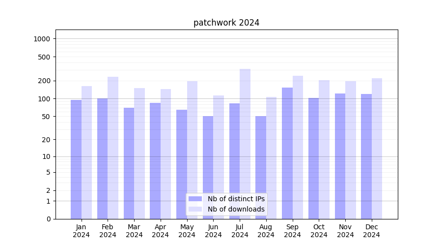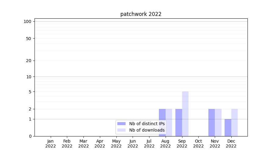 Number of downloads for workflow package patchwork, year by year, from 2025 back to 2015 (years with no downloads are omitted):